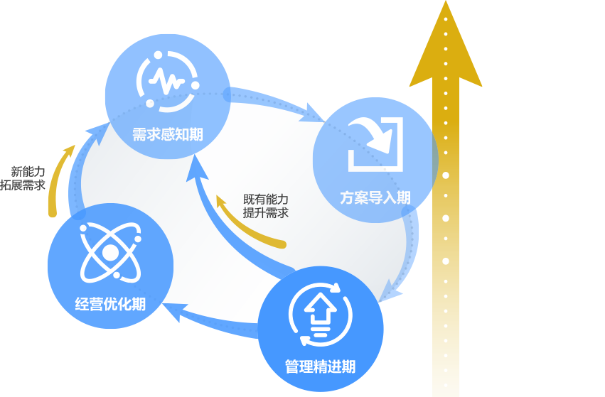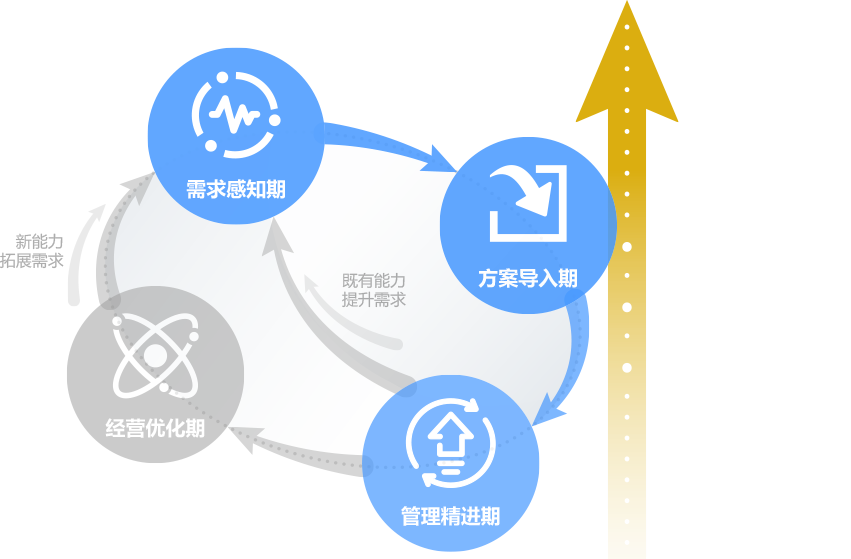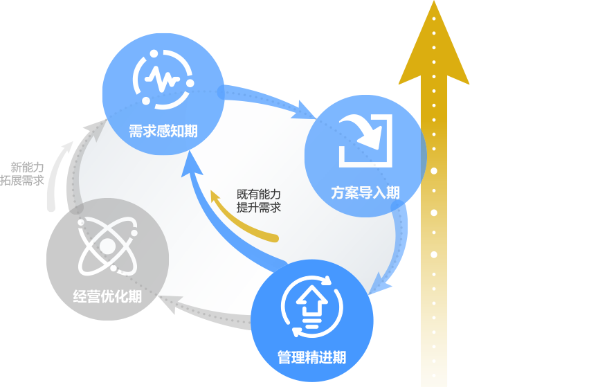公海555000JC线路检测中心将实现客户应用价值分为四个阶段,分别为需求感知期、方案导入期、管理精进期与经营优化期。在不同的周