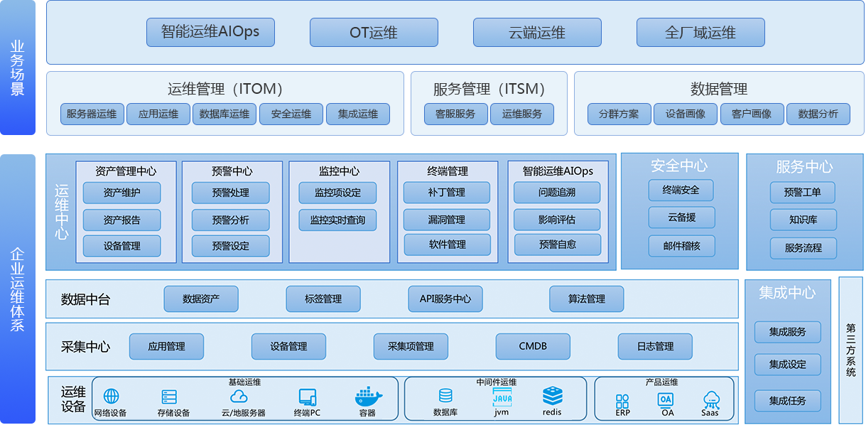 以运维中心、安全中心、服务中心、集成中心为基础,提供运维管理、服务管理、数据管理的能力