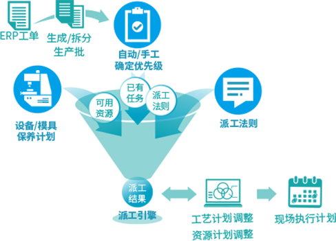 工单抛转到MES系统后,即可根据设备负荷设备状况、加工需求,将任务、人员分配到每一机台,能根据生产资源调整。