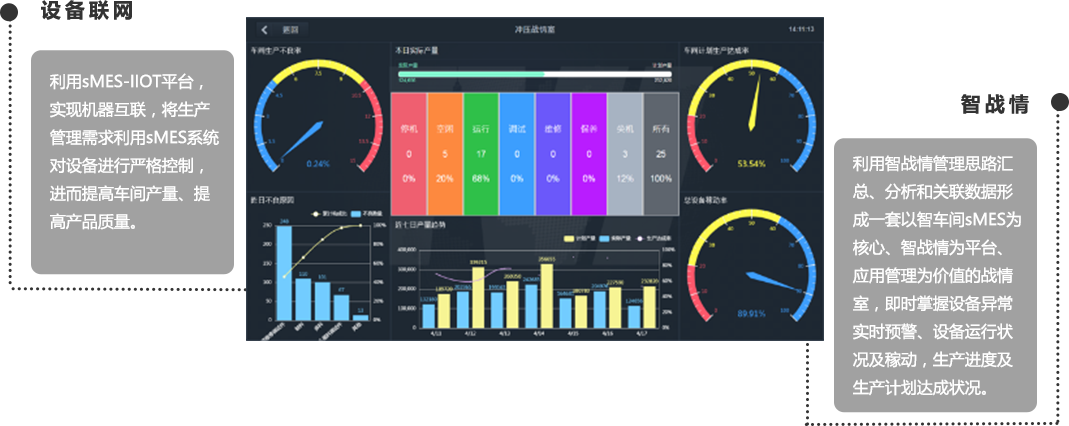 利用智战情管理思路汇总、分析和关联数据形成一套以智车间sMES为核心、智战情为平台、应用管理为价值的战情室,即时掌握设备异常实时预警、设备运行状况及稼动,生产进度及生产计划达成状况。