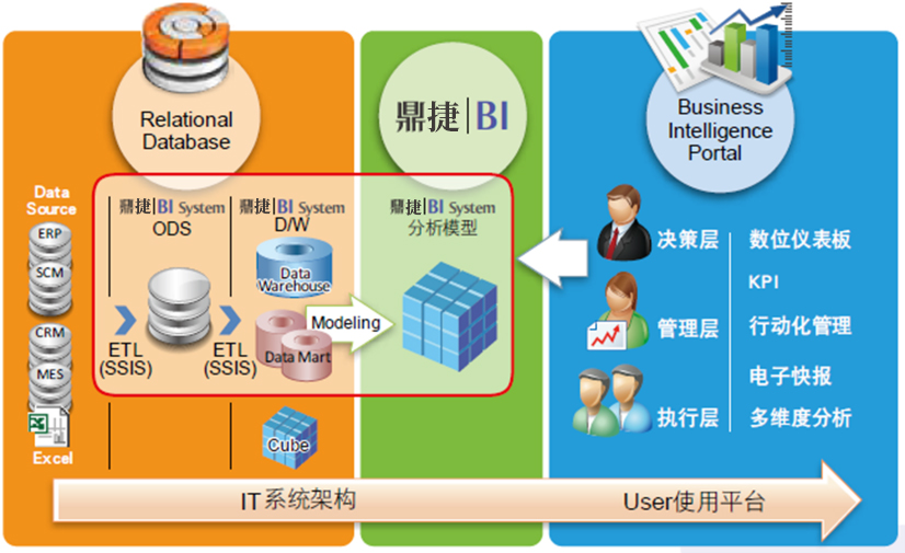 Store)架构,以多年产业经验、预先建置模板,将营运数据分门别类成不同的主题,经过萃取、转换再加载,随时提供用户作为分析报表的依据,与较新信息同步。产品具备高度灵活的个性化修改功能,可作为企业未来扩充BI规模的较佳基石。