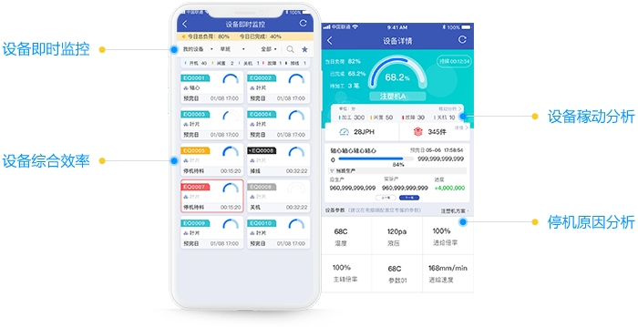 • 实时监控设备状态、分析设备停机原因,提升设备稼动率;