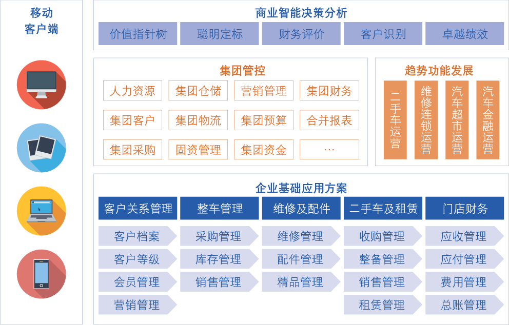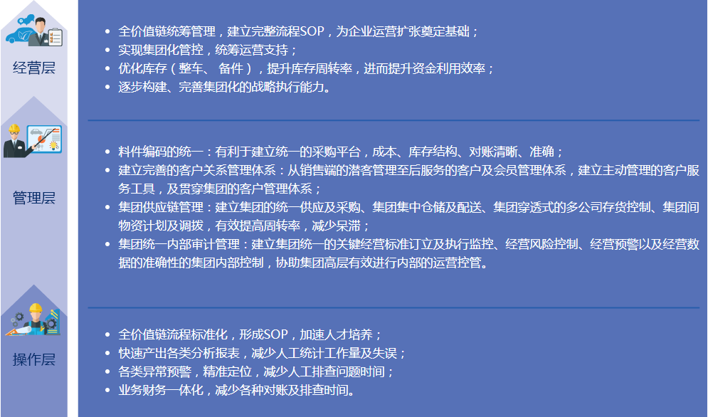 - 整合集团多品牌业务流程,制定集团统一管理的规则,实现销售与售后数据快速无缝的传递,提升企业资源集中共享的能力。