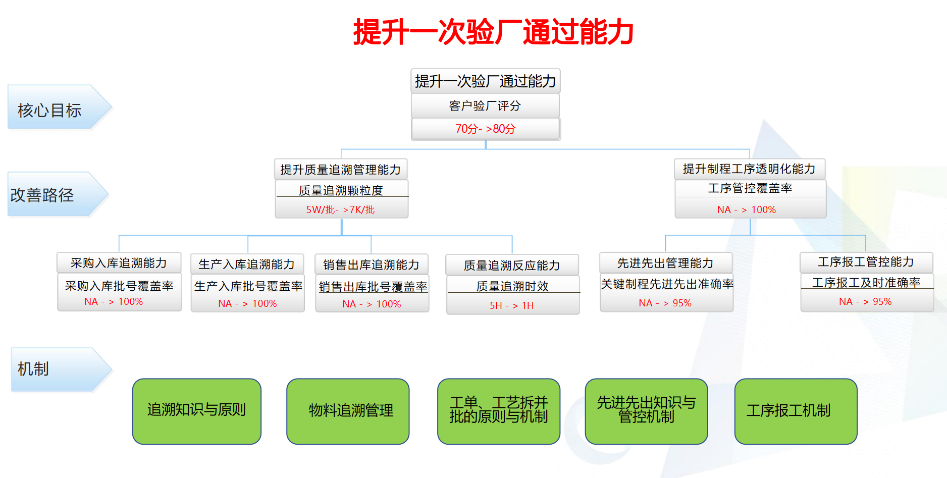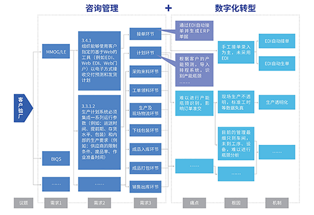由于汽车行业验厂的专业性, 单纯依靠数字化转型并不是最优解,难以从根本上通过整车厂的审核。公海555000JC线路检测中心以管理咨询加数字化转型的组合拳来协助伙伴应对客户验厂,从业务流程的改善、现场执行的改善、人员能力的改善、工具系统的改善四个维度,加速管理变革,提升运营能力,助力企业通过客户验厂。