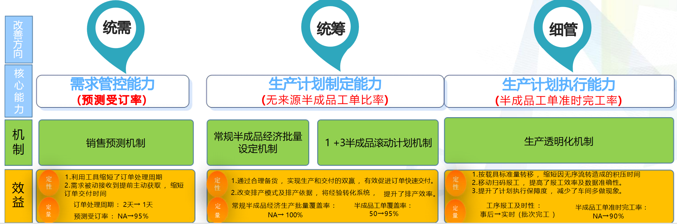 建立客户分类的管理原则,收实现需求管理的全面和准确;优化半成品的经济批量策略,建立1+3滚动计划机制,提升计划管理的能力。